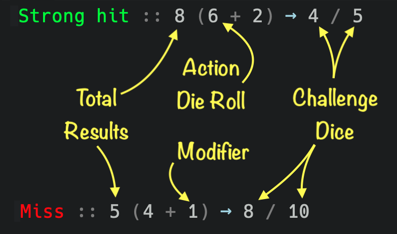 0,1and6roll dice and display the result. Not very interesting. Drolls the Ironsworn dice, two d10s and a d6 allowing you to add all the modifiers you want. Better.e,r,i,h, andwroll against your character's edge, heart, iron, shadow and wits respectively.l,s, andprolls against your current health, spirit and supply respectively.L,S, andPallows you to adjust your health, spirit and supply respectively.Mlet you change your momentum (rolls that benefit from momentum will show it)-