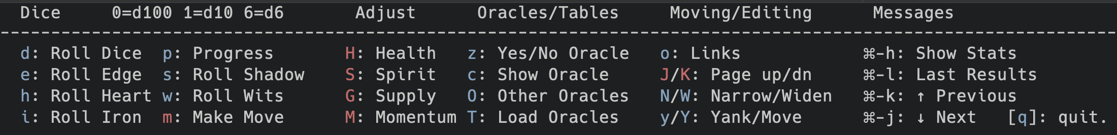 0,1and6roll dice and display the result. Not very interesting. drolls the Ironsworn dice, two d10s and a d6 allowing you to add all the modifiers you want. Better.e,h,i,s, andwroll against your character's edge, heart, iron, shadow and wits respectively.-